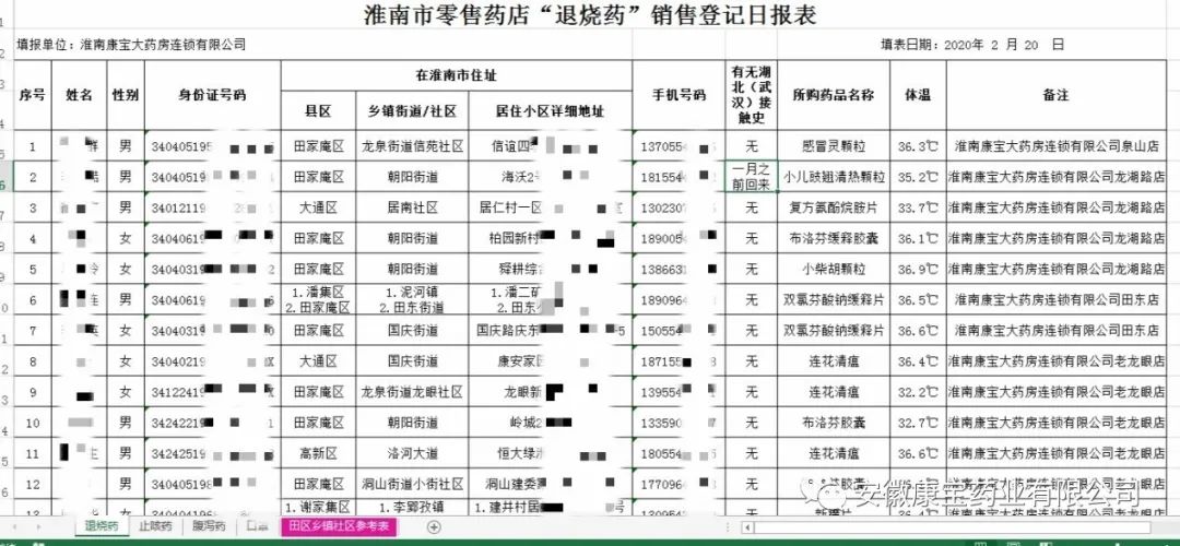 自2月5日起,質(zhì)管部每日協(xié)助康寶各門店對(duì)“退燒藥、止咳藥、腹瀉藥、口罩”的銷售情況實(shí)行登記報(bào)告,詳細(xì)登記購買人的身份信息、居住地址、聯(lián)系方式、有無湖北(武漢)接觸史等,協(xié)助淮南市疫情防控中心開展新冠肺炎疫情的全面排查和精準(zhǔn)摸排,為全市疫情防控工作提供了重要的信息支持。