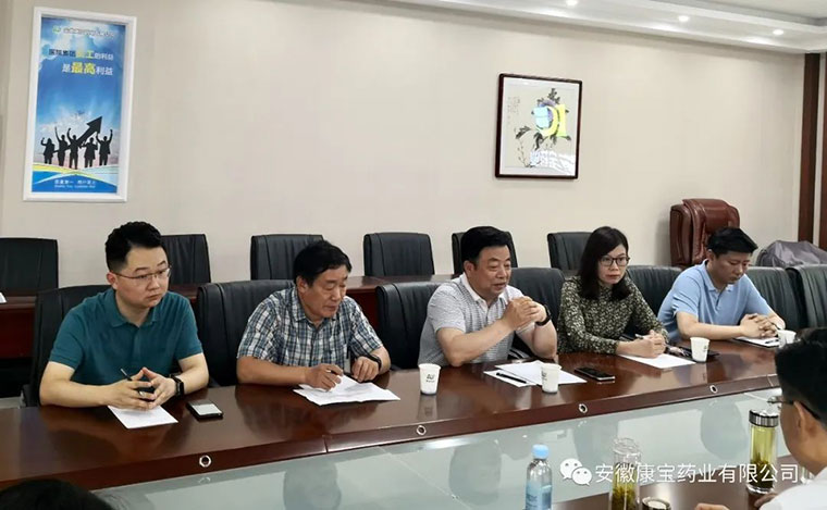 6月23日上午,淮南市政府副秘書長聶友俠、淮南市商務局局長梁廣賢、淮南市大通區常務副區長明冠雷、淮南市市場中心主任童志友、大通區商務局副局長江萍,來到康寶藥業走訪調研。康寶藥業董事長朱興林熱情接待了各位領導并陪同調研。