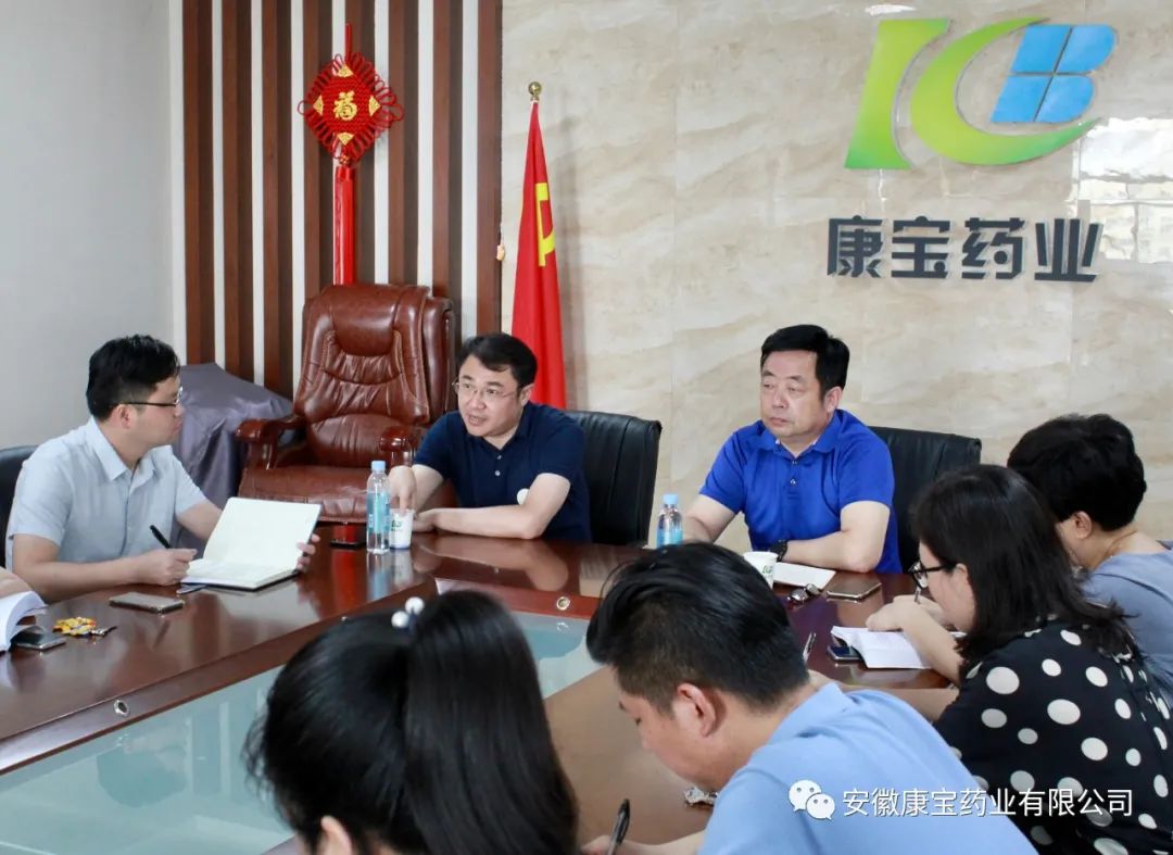 2020年8月11日下午,醫院集團總經理江永強來安徽康寶藥業有限公司召開全體員工會議。康寶藥業董事長朱興林及全體員工參加此次會議。