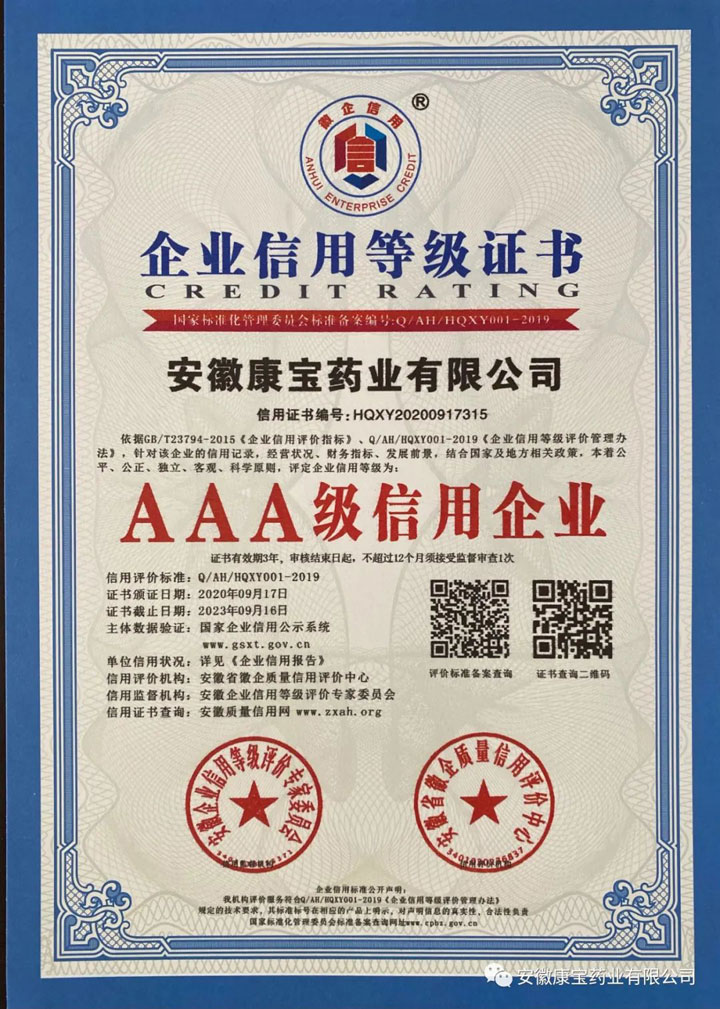 近日,安徽企業(yè)信用等級評價專家委員會公布了2020年“AAA級信用企業(yè)”評選結(jié)果,安徽康寶藥業(yè)有限公司喜獲“AAA級信用企業(yè)”榮譽稱號,為最高信用等級。